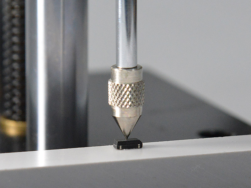 Überprüfung der Gehäuse-Druckfestigkeit eines Uhrenquarzes vom Typ IC 9 im Labor (Bild rechts): Chipgehäuse aus Kunststoff werden im Spritzgussverfahren hergestellt. Nur einwandfrei gefertigte Gehäuse gewährleisten dauerhaften Schutz gegen schädliche Umwelteinflüsse und überstehen Lötvorgänge ohne Schaden zu nehmen.