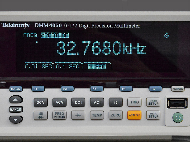 Frequenzmessung eines Uhrenquarzes mit 32.768 kHz, eingebaut in der fertigen Oszillatorschaltung: Frequenzstabilität und minimale Drift sind essentiell für Timer-Anwendungen, bei denen es „genau geht“. RED FREQUENCY prüft deshalb die Einhaltung der spezifizierten Parameter gemäß Datenblatt in regelmäßigen Abständen ebenfalls ganz genau.